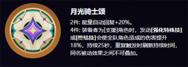月光骑士颂(4件):装备者为【支援】角色时,发动强化特殊技或终结技可使全队造成的伤害提升18%,持续25秒;重复触发可刷新持续时间,但同名效果不可叠加。