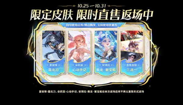 本次返场的6款皮肤均支持通过点券或绑定点券购买,购买皮肤时支持使用优惠卡。同时,直售返场的三款皮肤,本次返场后将不再以直售形式返场。