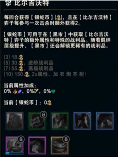 比尔吉沃特羁绊效果:可开启神秘商店,用银蛇币采购每回合获得银蛇币,击杀后获得额外银蛇币