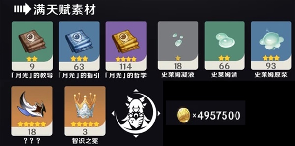 9、10级:「月光」的哲学*16、史莱姆原浆*12、博士周本新材料*2、智识之冕*1、摩拉*700000。